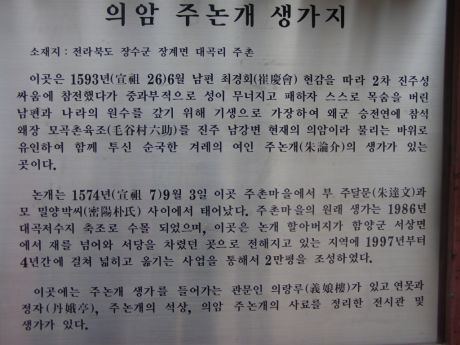 史實과는 年代가 어울리지 않는 口傳 논개가 최경회의 부실이 되는 전 단계에 관한 얘기인데 최경회의 행장을 기록한 『일휴당실기』(日休堂實記)와 비교해 보면 연대가 맞지 않는 모순점이 드러난다. 즉 최경회가 장수현감을 재임한 시기는 1577~1579년이었는데 그때는 1574년생인 논개의 나이가 너덧살에 불과했다. 그런 논개를 김풍헌이 며느리가 아닌 민며느리로 맞아들이려고 했다고 할지라도 어색하다. 1592년 8월 전라우의병장으로 추대된 최경회는 의병을 이끌고 남원을 거쳐 장수로 진출했다. 장수라면 14년 전 그가 현감으로 재직하면서 선정을 베풀어 공덕비가 세워진 고을이었다. 그런 만큼 그에게 장수현은 모병과 병참에 유리한 지역이었을 것이다. 더욱이 왜군의 세력 범위에 들어간 경상도와 접경지역이어서 접적이동(接敵移動)면에서도 편리한 지역이었을 터이다. 최경회의 의병은 장계면 월강평(月岡坪)에 유진(留陣)하면서 의병을 초모하여 조련을 시켰다고 한다. 최경회 부대의 병력은 1천6백명이었다. 월강평은 장계4거리에서 26번 국도를 통해 5리쯤 동진하면 왼편으로 펼쳐진 넓다란 들인데 북쪽 산기슭에는 최경회의 위패를 모신 월강사(月岡祠)가 보존되어 있다. 장수 일대의 사적을 답사한 후 들렀던 찻집에서 『WIN』 역사인물탐구팀은 우연하게 김상두(金祥斗) 장수군수를 만나 논개사적지의 확장·정화를 위한 마스터플랜을 들었다. 김군수는 장계면의 논개 생가와 장수읍의 의암사 그리고 함양군 서상면에 있는 논개무덤을 삼각형으로 잇는 「민족정신 교육의 장」 건설을 구상하고 있다. 현재 시공 중인 대전~진주간 고속도로의 완공 후(2001년 11월 개통) 논개 사적지를 찾는 참배객 수가 크게 늘어날 것에 대비하고 이에 따라 낙후된 지역경제도 활성화시킨다는 민선 지방자치단체장다운 계산이다. 김군수에 따르면 현재 경내 부지가 1만평에 불과한 의암사는 2만7여천평의 주변 토지를 사들여 3만7천평 규모로 확장하고 영상교육관·휴게실 등 부대시설을 갖추게 된다. 44억원의 사업비(국비 22억원·지방비 22억원)가 투입되는 확장사업은 토지매입이 거의 마무리 단계에 있어 곧 토목·건축·조경공사에 들어갈 단계다. 장수군은 의암사와 논개생가 사이에 11km의 직선도로를 개설할 계획이다. 논개 생가와 함양군의 논개 묘역도 민재에다 임도(林道)를 닦아 연결시키기로 했다. 임도 개설은 작년 말 김상두 장수군수와 정용규 함양군수가 민재의 정상에서 만나 절반씩 책임지고 실현하기로 합의했다고 한다. 死後 4백년 만에 족보에 오른 「義巖夫人」 『WIN』 역사인물탐구팀은 「논개묘」를 찾아 26번 국도를 통해 육십령(해발 1,264m)을 넘어 함양군 서상면으로 진입했다. 육십령은 전라북도와 경상남도의 도계(道界)인데 옛날엔 도적과 맹수가 많아 최소한 60명이 작당해야만 넘을 수 있다 하여 그런 이름이 붙었다고 하는 험한 고개다.